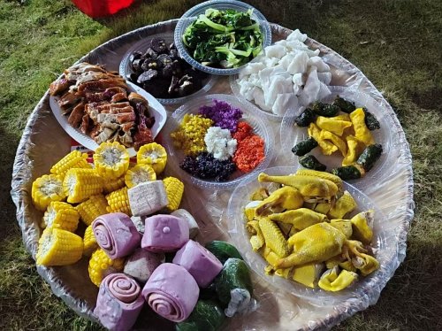 簸箕藏珍味 大集汇农情:活动现场,一张张竹编簸箕铺展如画卷,翠绿芭蕉叶衬底,巴马香猪、白切鸡、火麻汤等特色佳肴错落排布,荤素杂粮搭配间尽显壮乡饮食智慧。这一源于农耕文明的传统宴席,曾是壮族先民劳作间隙共享食物的温馨载体,如今更成为招待贵宾的最高礼遇,南瓜雕刻的龙凤孔雀造型点缀其间,既显仪式感又藏民族团结的美好寓意。